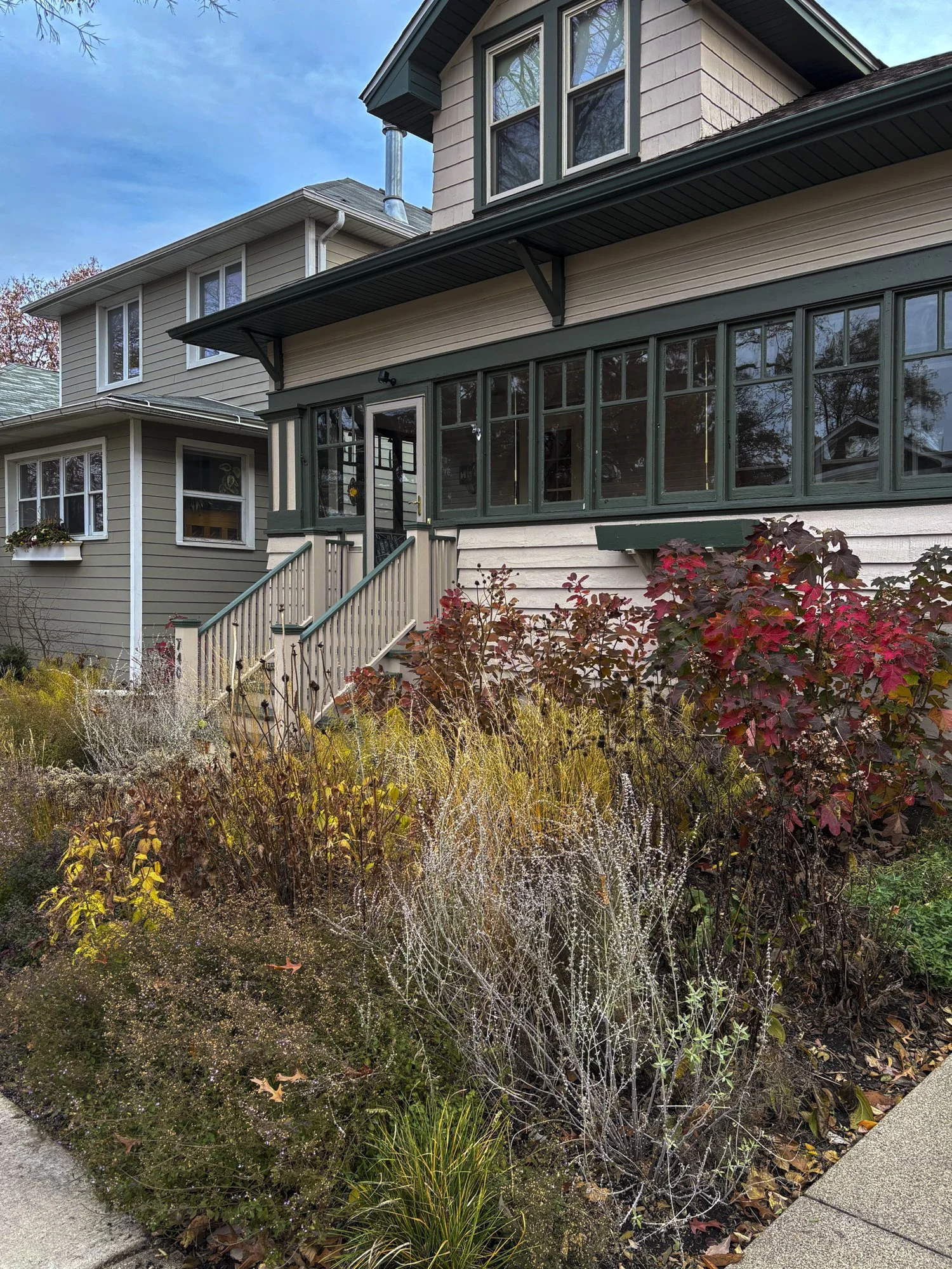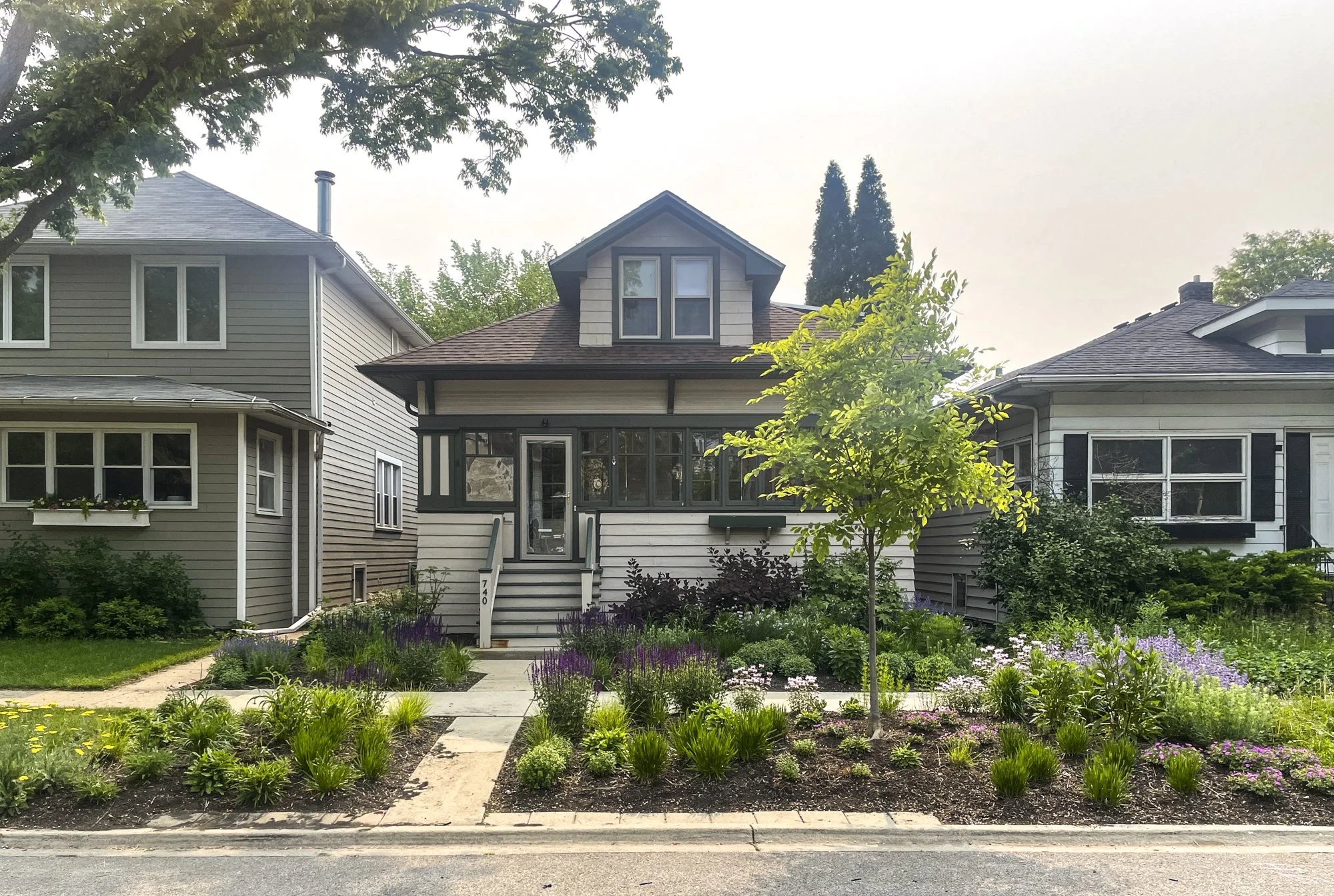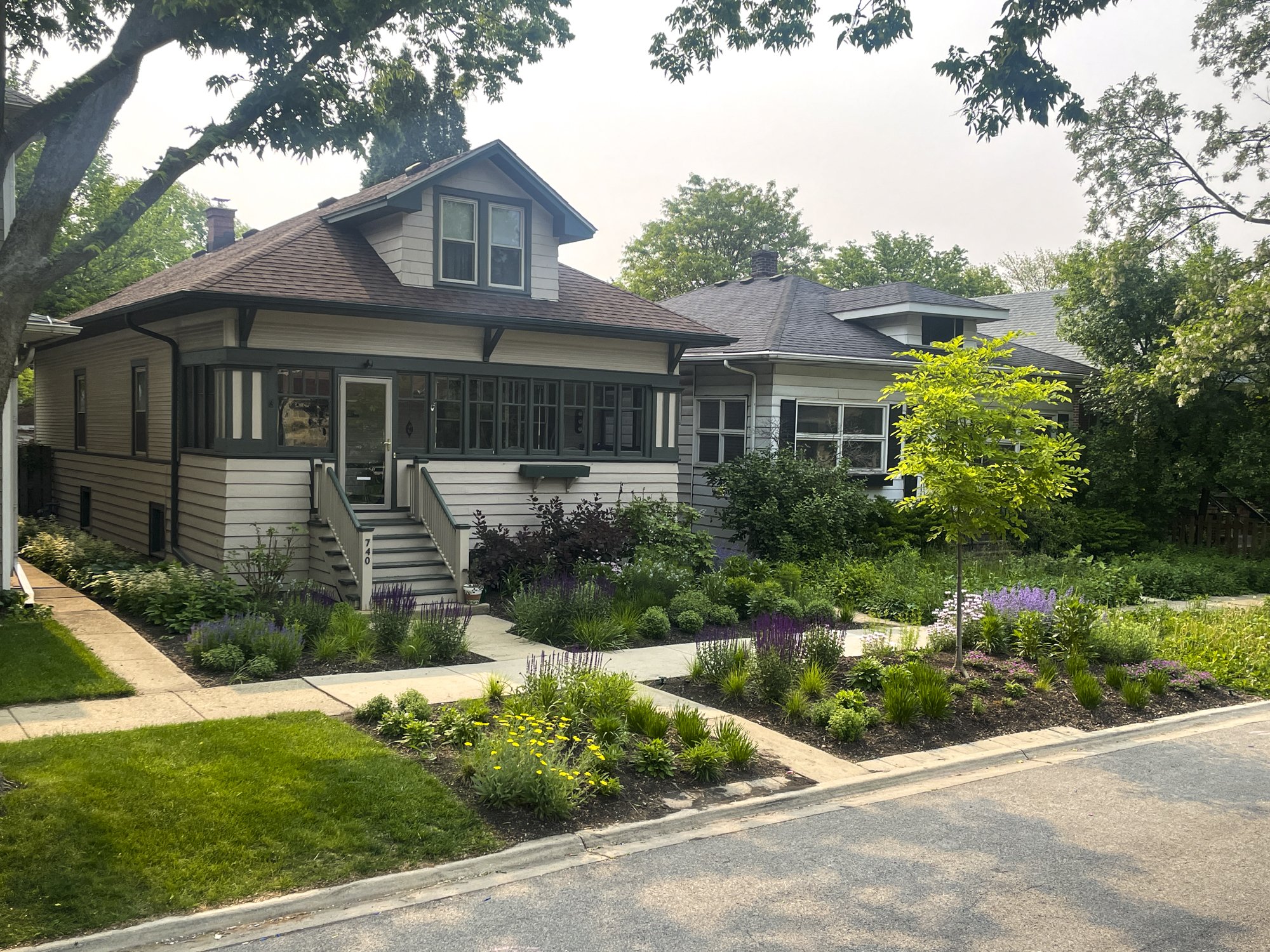 At this South Oak Park residence, we replaced a builder-grade landscape plan with a front yard and parkway garden designed for longevity and ecological health. Lawn was removed and an invasive callery pear was replaced with a layered mix of perennials and shrubs, bringing seasonal interest, habitat value, and a stronger sense of place.