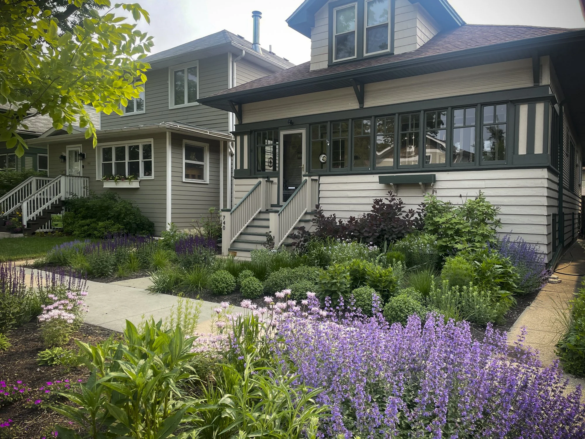 We reimagined this North Oak Park home’s front and back yard to create healthy and intentional outdoor spaces. In order to create a new planting that provides interest throughout the year, we removed lawn and densely growing creeping bellflower from the front yard to make way for a new planting design that provides interest throughout the year.