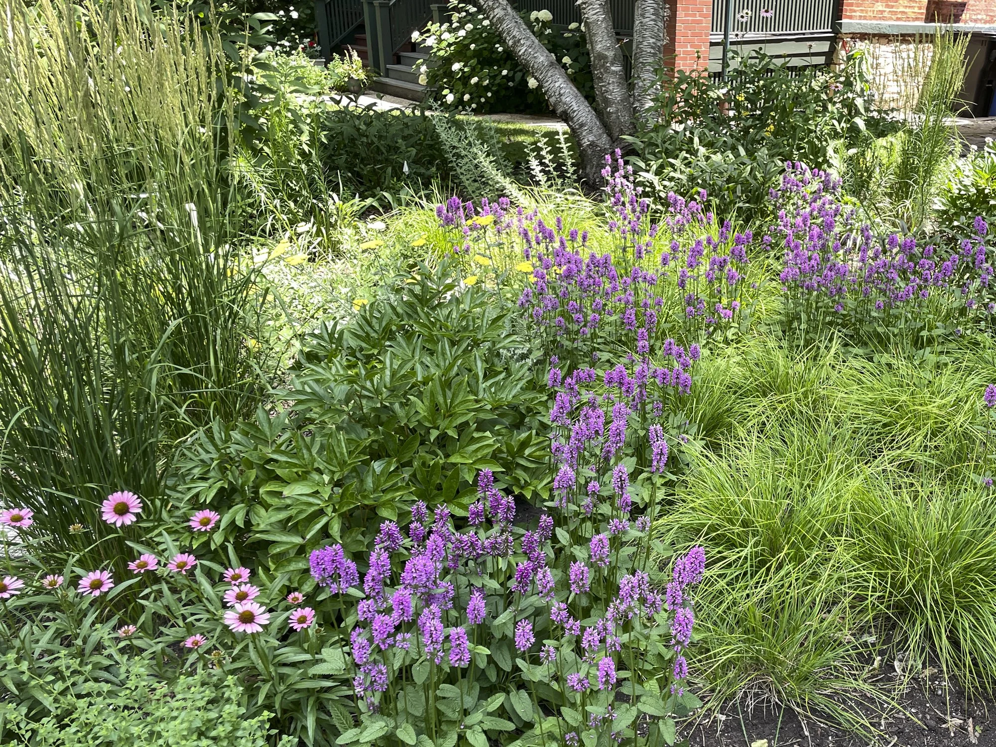 A new walkway to the street, composed of large concrete steppers set atop crushed bluestone, introduces both structure and approachability to the landscape. As the plantings continue to establish, the garden grows fuller and more cohesive, transforming a standard foundation planting into a vibrant, welcoming streetscape.