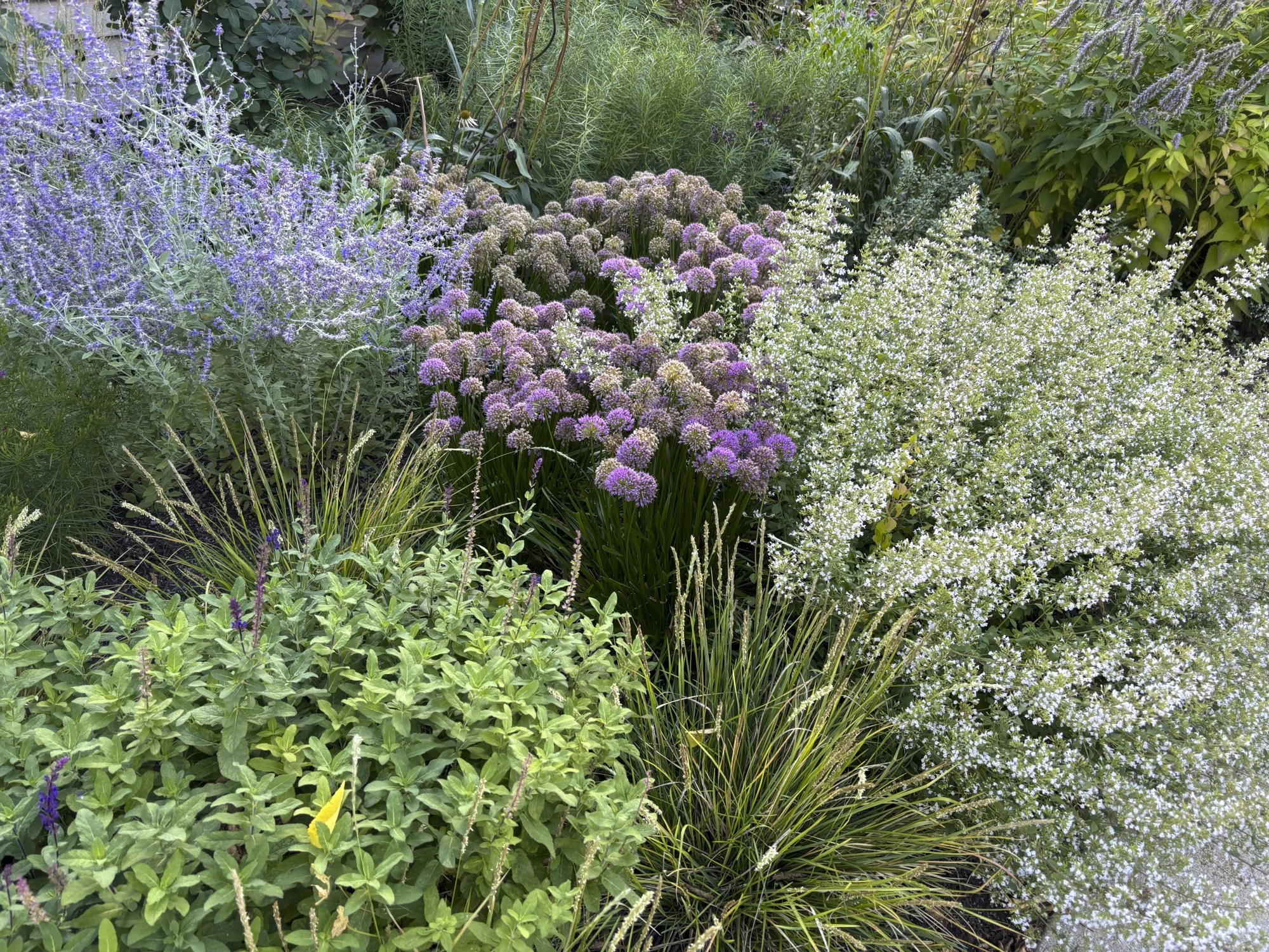 At this North Oak Park corner residence, we began by removing dense, overgrown shrubs and invasive species from both the front yard and adjacent parkway, opening the space to light and new possibility. In their place, we installed a richly layered perennial garden that wraps the corner with texture, movement, and season-long interest. Black steel edging in the parkway provides a clean, durable frame for the planting, defining the garden while allowing it to feel abundant.