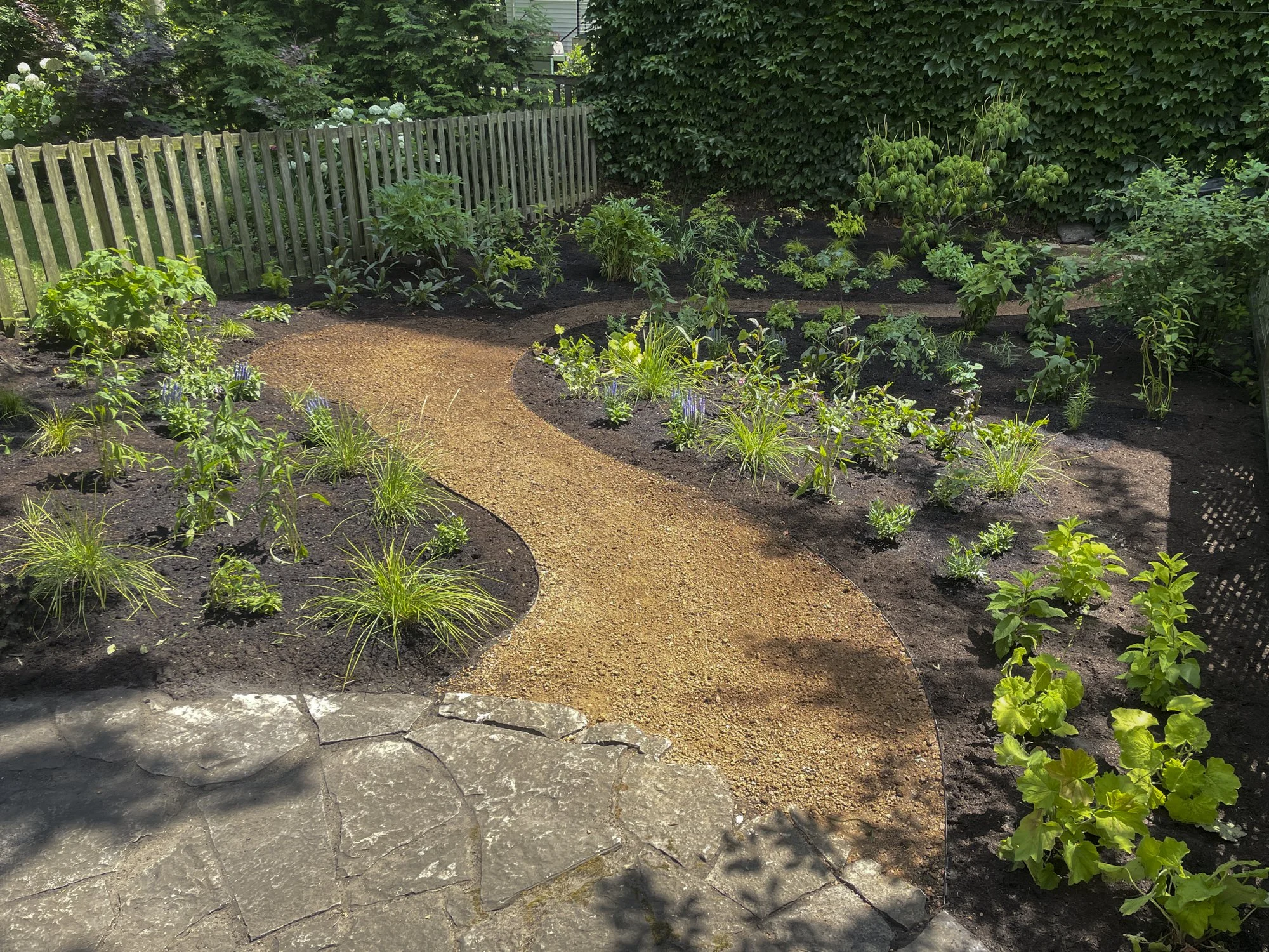 HYDE PARK RESIDENCE - lawn removal, hardscaping, garden installation, stewardship. Front yard Installed 2024. Back yard installed 2025.